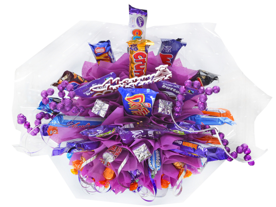 The standard-sized bouquet is filled with about 20 large bars from Cadbury, Nestle, and Mars (all your favourites) and about 12 small chocolates, e.g., Cadbury Roses, Celebrations, etc. that are delicately weaved in between purple luxury wrapping, mounted in a purple box and finished off with luxury Christmas sprays for that essential final touch.