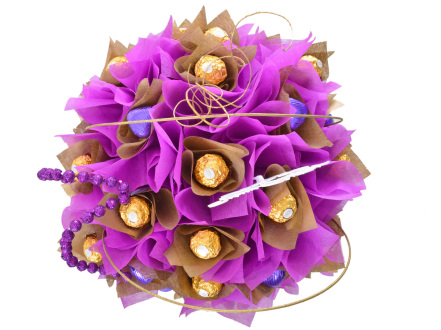 The chocolate bouquet is filled with either delicious Ferrero Rocher or Lindor Lindt or mixed together with Belgian Milk Chocolates delicately weaved in between purple and gold luxury tissue. It is then mounted in a solid purple box and finished off with luxury Christmas sprays and a large ribbon for that essential final touch.