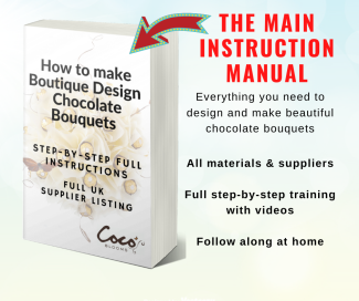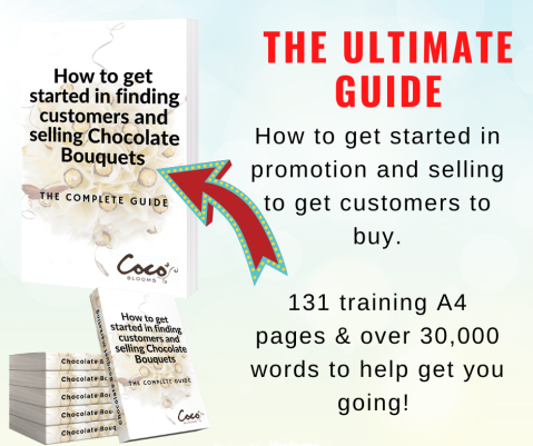 Our very detailed professional "How to find customers and sell chocolate bouquets' training manual is packed with practical advice to help you get started from scratch including general start up advice, getting a logo, pictures of your range, social media promotion, website, pricing, events and showing your bouquets to find local customers and repeat orders. The detail is considerable - 130 A4 pages full of practical advice and steps to get started and keep going.